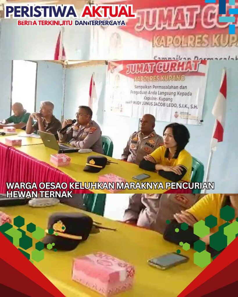 www.peristiwaaktual.com.ǁNTT,7 Februari 2026-Warga Desa Oesao, Kecamatan Kupang Timur, Kabupaten Kupang mengeluhkan maraknya pencurian hewan ternak kepada pihak Polres Kupang. Keluhan tersebut disampaikan saat kegiatan Jumat Curhat yang digelar Polres Kupang di Kantor Desa Oesao, Jumat (6/2/2026) pagi. Selain persoalan pencurian ternak, warga juga mengeluhkan tingginya kenakalan remaja, peredaran dan konsumsi minuman keras, tingginya angka pengangguran, izin keraiaman yang kerap melebihi batas waktu hingga kasus kekerasan dalam…