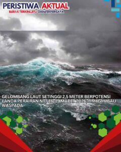 www.peristiwaaktual.com.ǁNTT,16 Maret 2026-Gelombang laut setinggi 2,5 Meter berpotensi landa Perairan NTT pada 16-19 Maret 2026. Menyikapi kondisi tersebut, Badan Meteorologi Klimatologi dan Geofisika ( BMKG ) mengimbau nelayan hingga operator kapal waspada. “Waspadai gelombang laut dengan tinggi mencapai 2,5 meter di wilayah Perairan NTT pada 16-19 Maret 2026,” kata Kepala Stasiun Meteorologi Maritim Tenau Kupang Yandri Anderudson Tungga di Kupang, Senin (16/3/2026). Ia menjelaskan potensi…