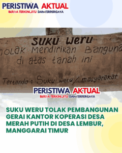 www.peristiwaaktual.com.ǁNTT,8 April 2026-Warga suku Weru, Desa Lembur, Kecamatan Kota Komba, Kabupaten Manggarai Timur (Matim) menolak pembangunan gerai Koperasi Desa Merah Putih (KDMP), di lapangan umum desa tersebut. Informasi yang diperoleh , Rabu (8/4), warga Suku Weru melakukan penolakan pembangunan kantor Gerai KSMP disana karena lapangan itu menjadi tempat umum bagi masyarakat desa setempat untuk pelaksanaan penggelaran olahraga atau kegiatan umum lainnya. Jika lapangan…