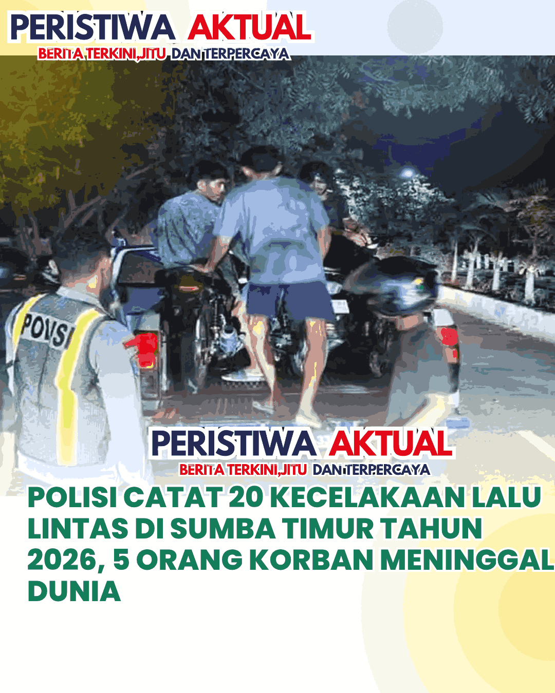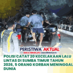 www.peristiwaaktual.com.ǁNTT,12 April 2026-Polisi dari Satuan Lalu Lintas (Satlantas) Kepolisian Resor Sumba Timur ( Polres Sumba Timur ), Provinsi NTT mencatat sebanyak 20 kecelakaan lalu lintas selama periode Januari sampai Maret 2026. Dari jumlah tersebut, sebanyak 5 orang korban meninggal dunia. Sementara yang mengalami luka berat sebanyak 18 orang dan luka ringan sebanyak 6 orang. Adapun jumlah kerugian materi mencapai Rp45 juta. “Jumlah kecelakaan 20…
