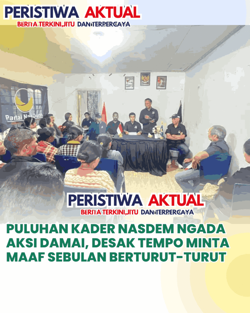 www.peristiwaaktual.com.ǁNTT,15 April 2026-Puluhan pengurus dan kader Partai NasDem se-Kabupaten Ngada, Nusa Tenggara Timur (NTT), menggelar aksi damai sebagai bentuk protes terhadap pemberitaan Majalah Tempo edisi 13–19 April 2026. Aksi dipusatkan di Sekretariat DPD Partai NasDem Ngada, Rabu (15/4/2026), dan dipimpin langsung Ketua DPD NasDem Ngada, Moses Jala, didampingi Sekretaris Ambrosius Molo. Sejak pagi, massa memadati lokasi sambil menyuarakan penolakan terhadap cover Majalah Tempo yang dinilai merugikan citra…